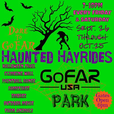 Take a ride through the Haunted Forest and stroll through the Halloween Trail to see farm animals and more at GoFAR USA Park. Hang out around the campfires, make some smores, climb the rockwall, shoot some paintballs, and enjoy a Halloween movie. Friday and Saturday nights, September 26 through October 25, 2025! Doors open at 6pm. Hayrides start at 7pm. Last Hayride departs at 10pm.