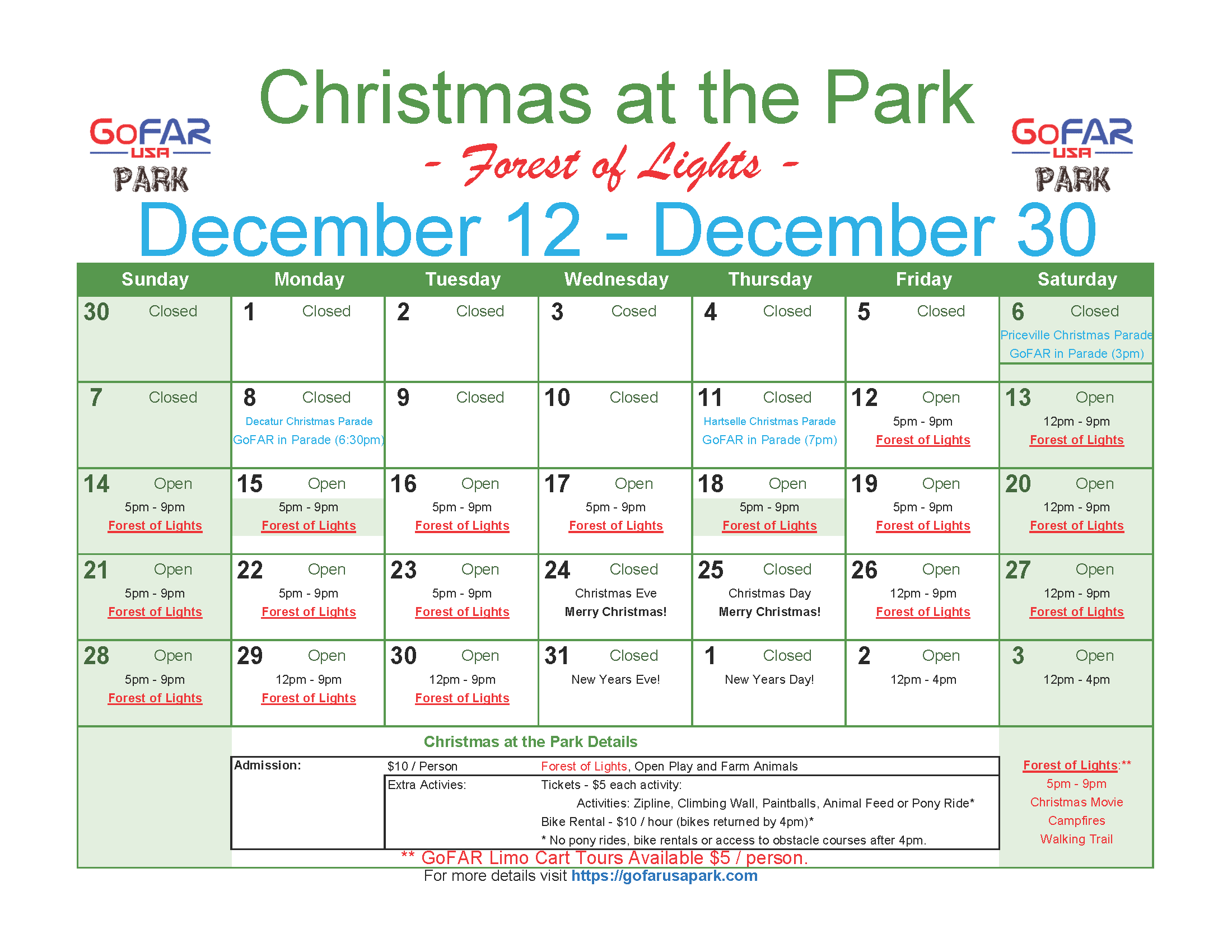 Take a stroll through the Christmas lights in the forest and around the farm at GoFAR USA Park. Hang out around the campfires, make some smores, zipline though the pines, climb the rockwall, shoot some paintballs, and enjoy a Christmas movie. See our calendar for scheduled nights!